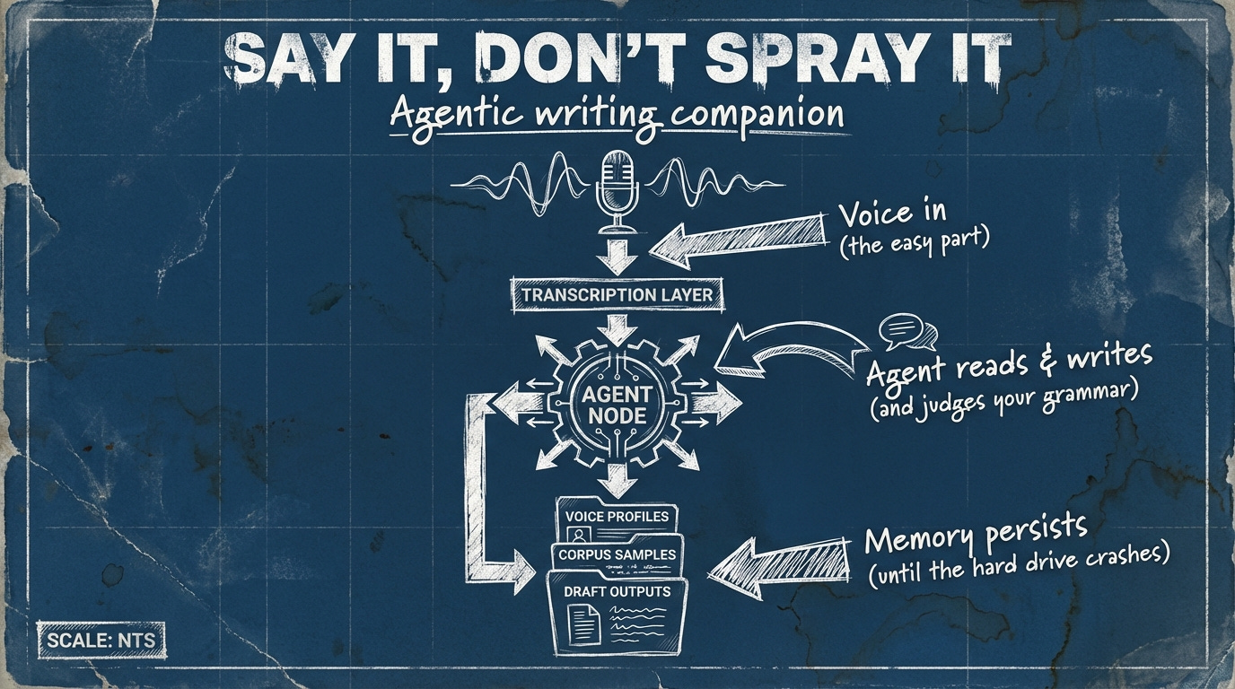 The agent isn’t just responding to prompts. It has tools -- read files, write files, list files -- and it uses them autonomously as part of doing its job. When I give Spray a dictation and ask for a draft, the agent reads the relevant voice profile, reads corpus samples from my existing writing, checks if there are previous drafts of this piece, and then writes something. It’s not working from the context I happen to paste into the prompt. It’s building its own context before it acts.